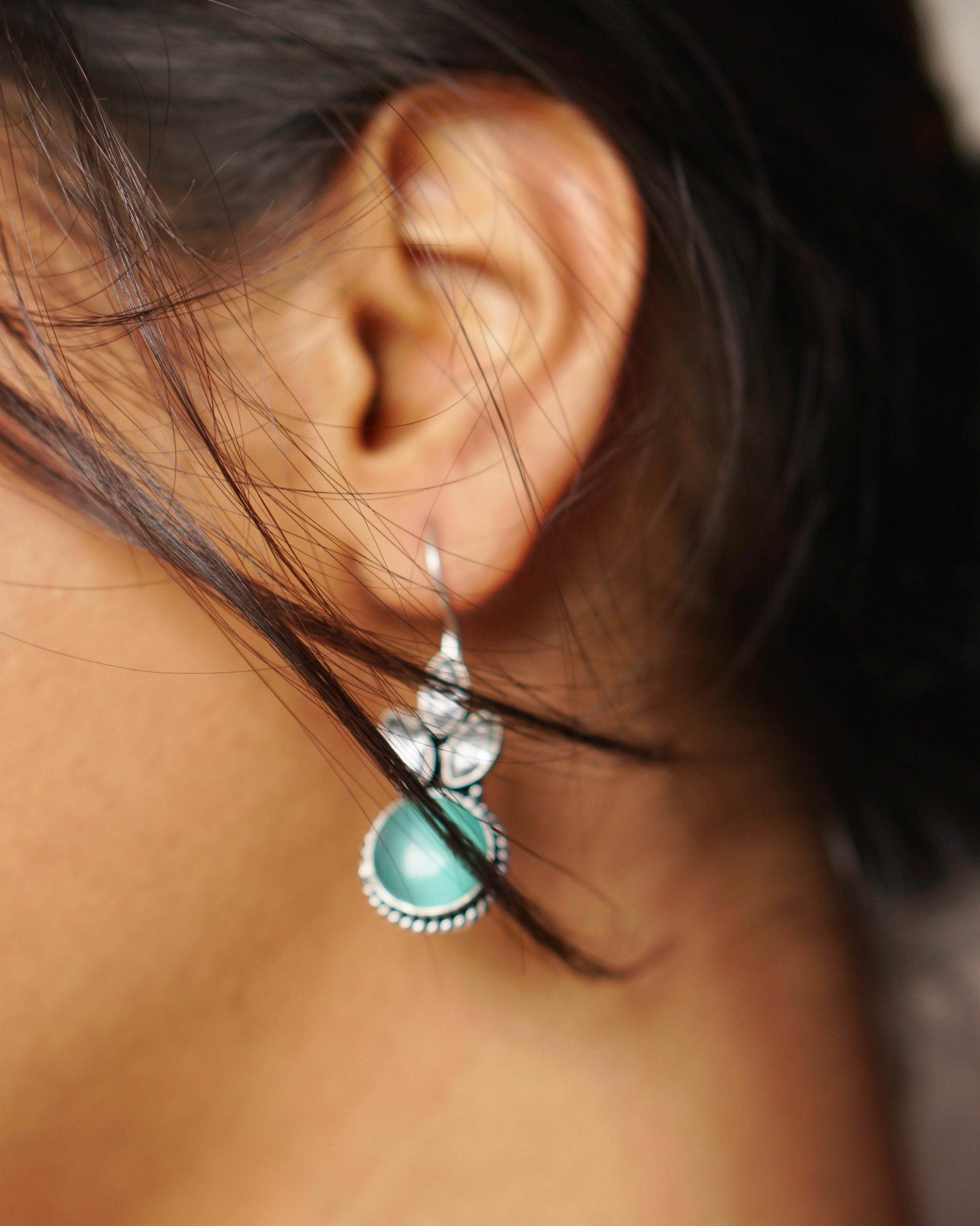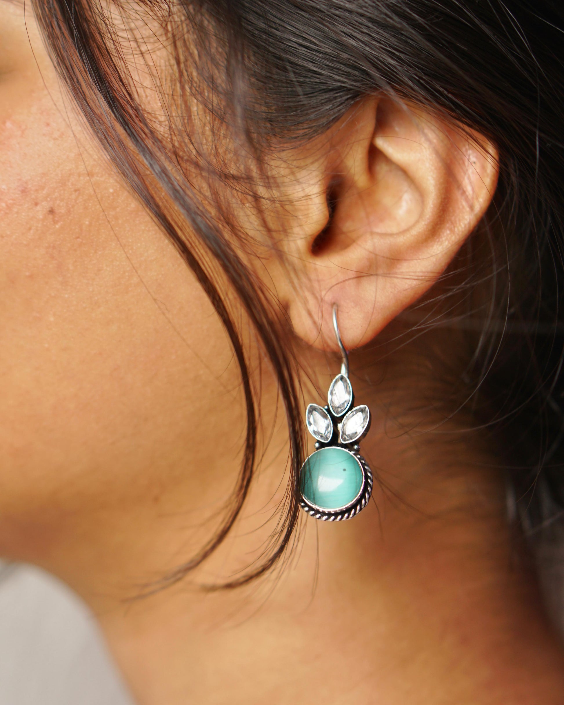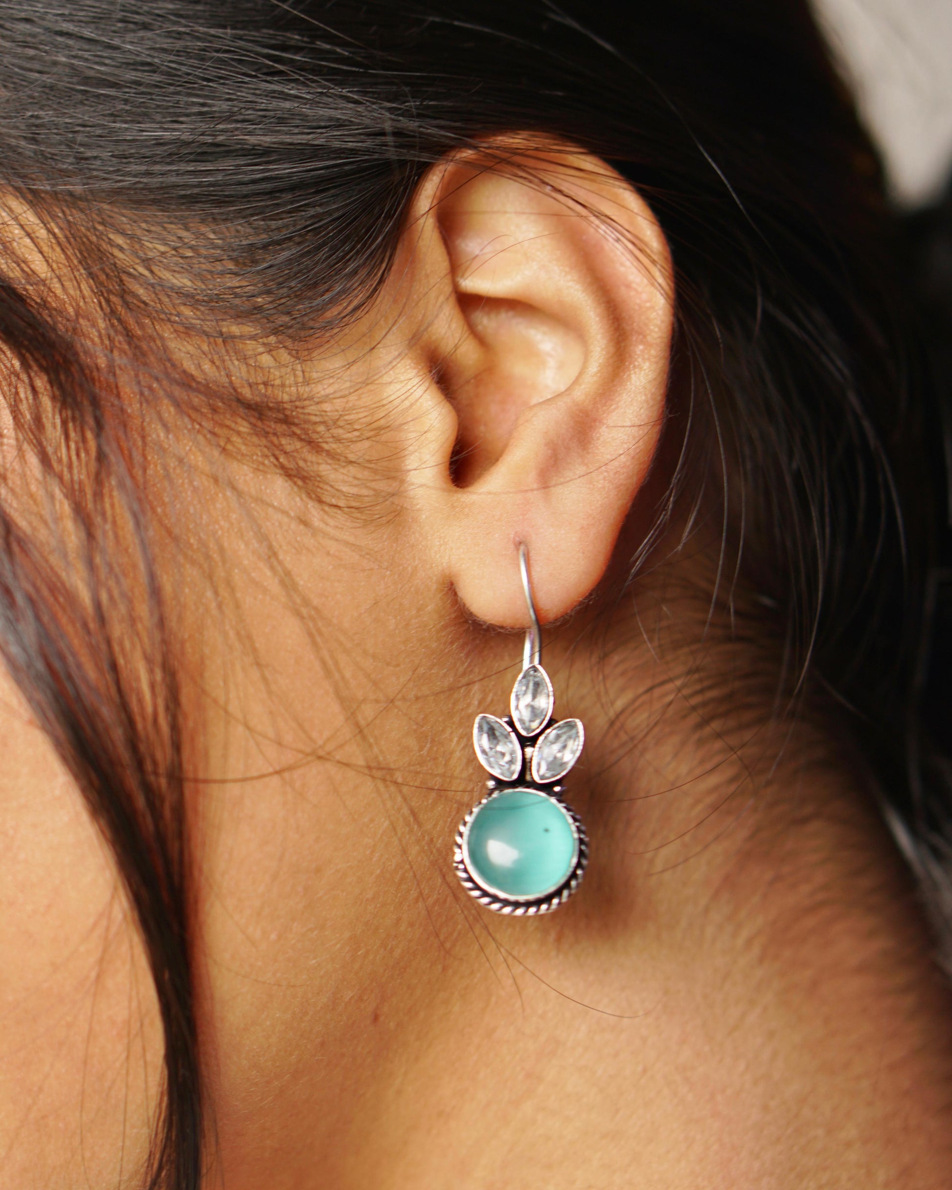 Elegant aqua gemstone earrings in oxidized silver – lightweight dangle design, perfect for daily wear, gifting, and minimalist boho styling.