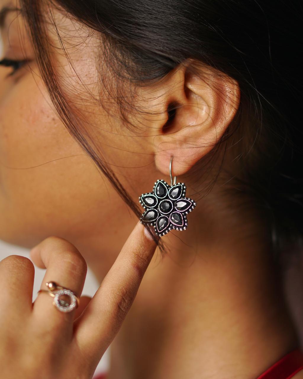 Dark Petal blends floral softness with fierce black elegance. These oxidised earrings feature jet-black stones arranged in a blooming stud silhouette — for the girl who’s delicate but never dull.