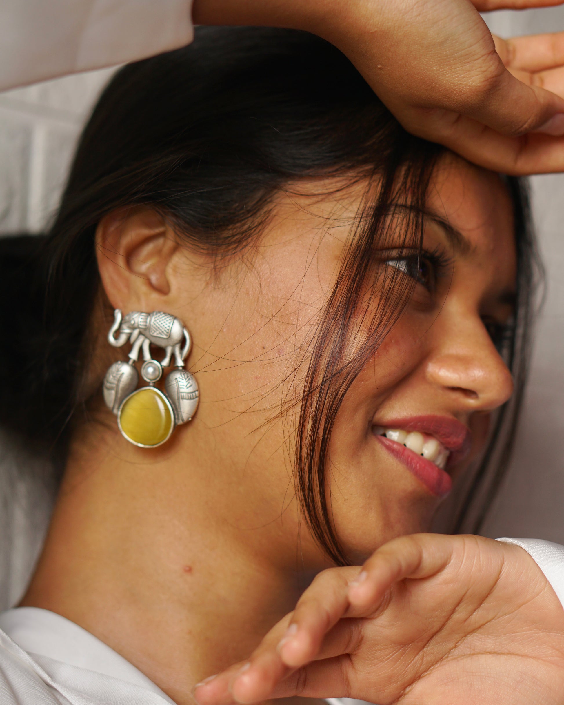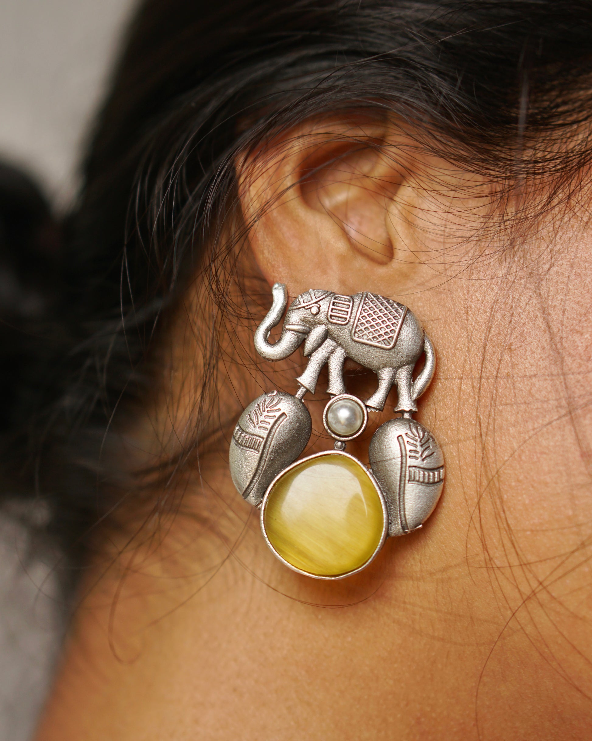 Embrace your bold side with Gajraaj, a handcrafted oxidised silver earring featuring a majestic elephant motif, intricate tribal patterns, and a moonstone-like gemstone that captures light like royalty. Inspired by India’s rich heritage and the symbol of wisdom and strength, this ethnic beauty is a true statement earring for women who love to blend tradition with contemporary edge.
