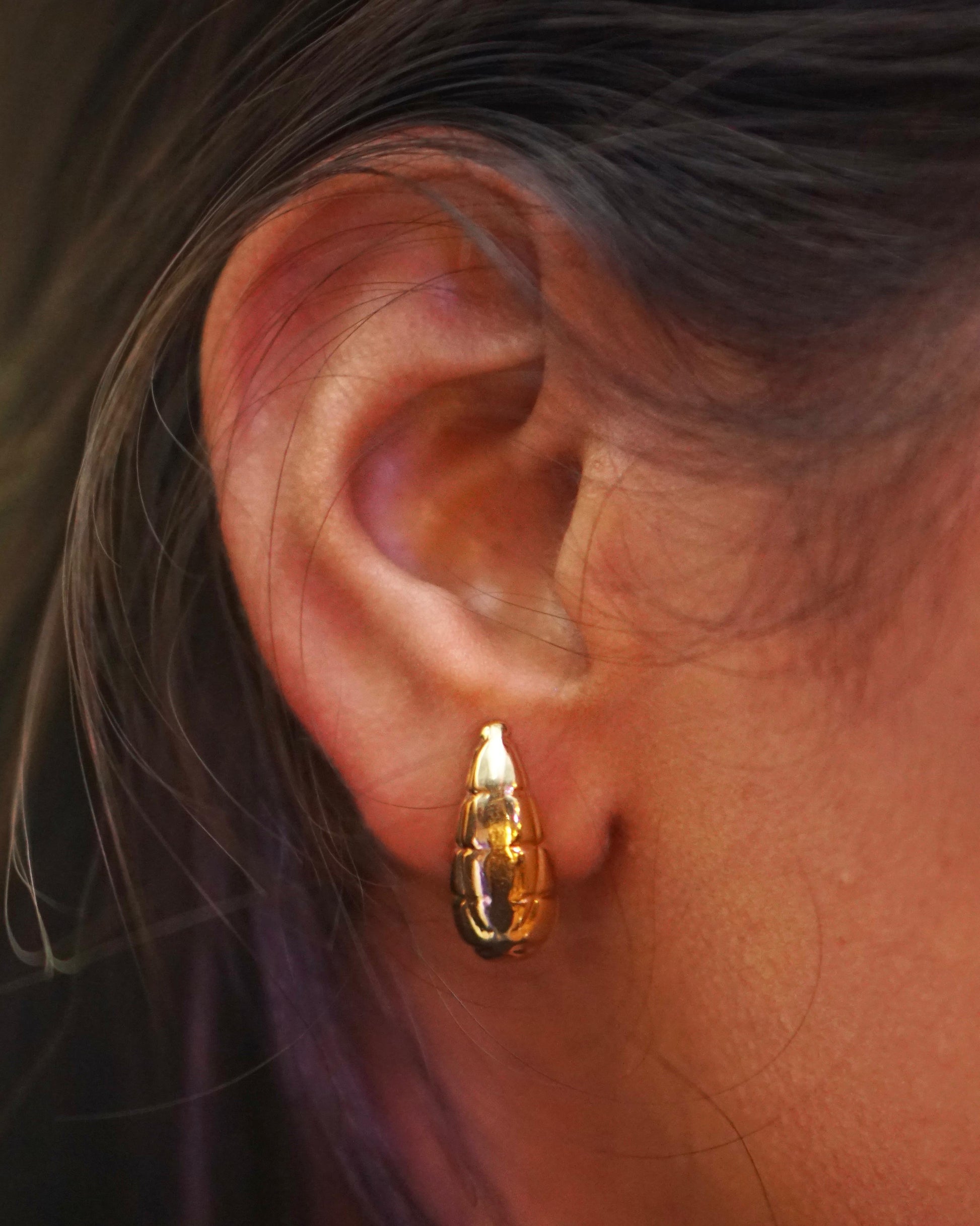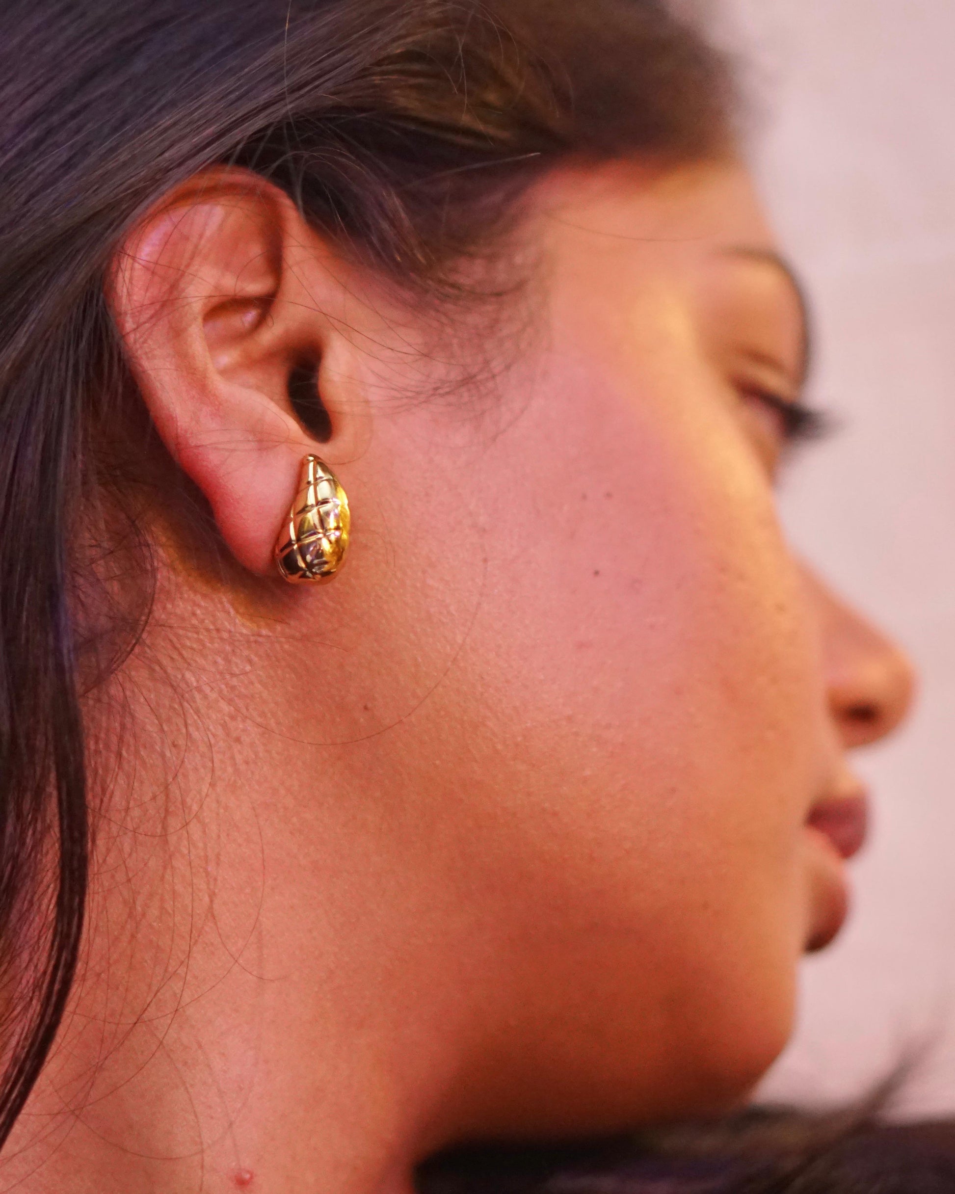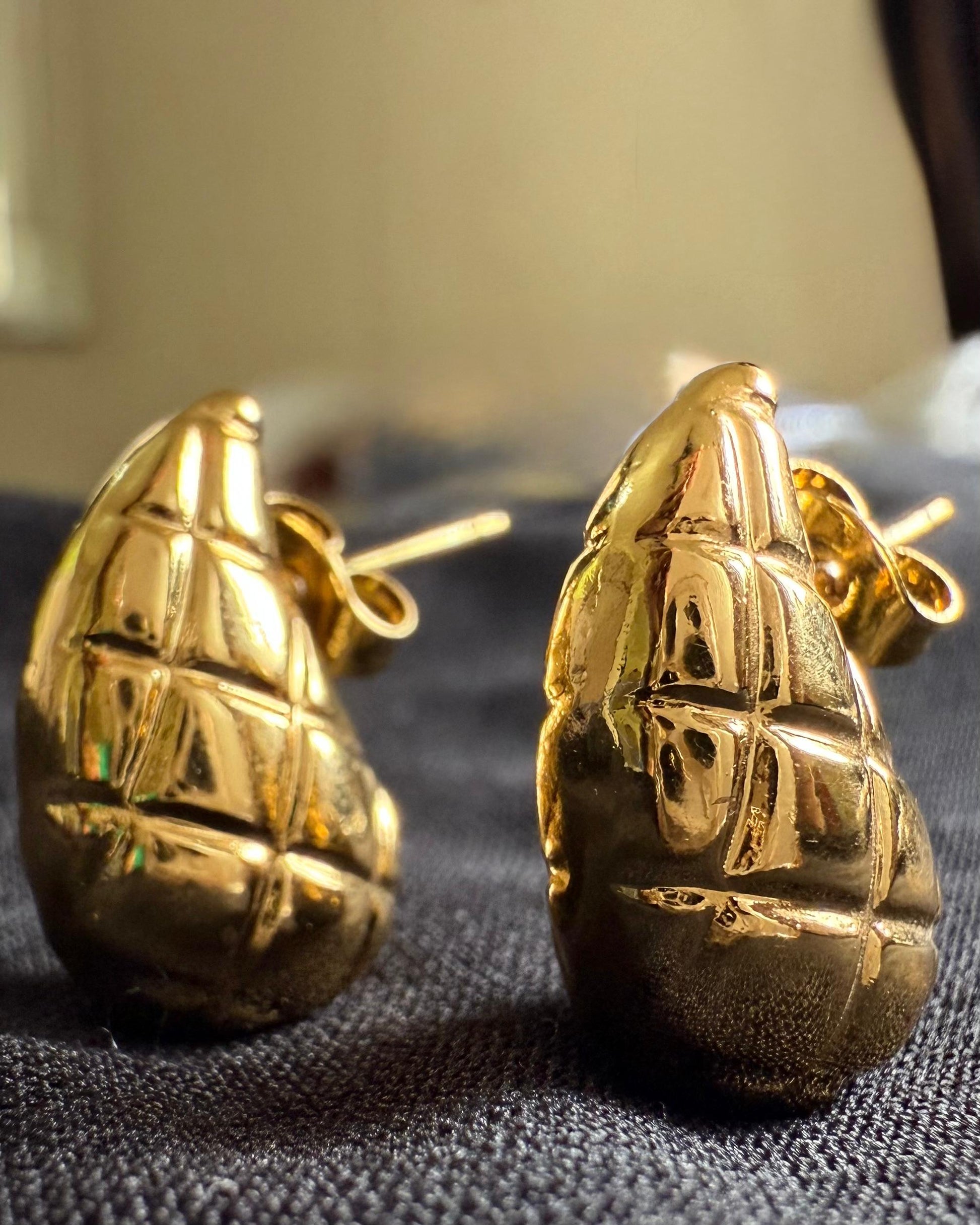 Introducing Gold Glitch – bold, unapologetic, and everything but basic. These sculpted gold-tone studs feature a distorted, puffy grid texture that looks like a luxurious “glitch in the system.” Perfect for those who like their jewelry loud, luxe, and layered with attitude.