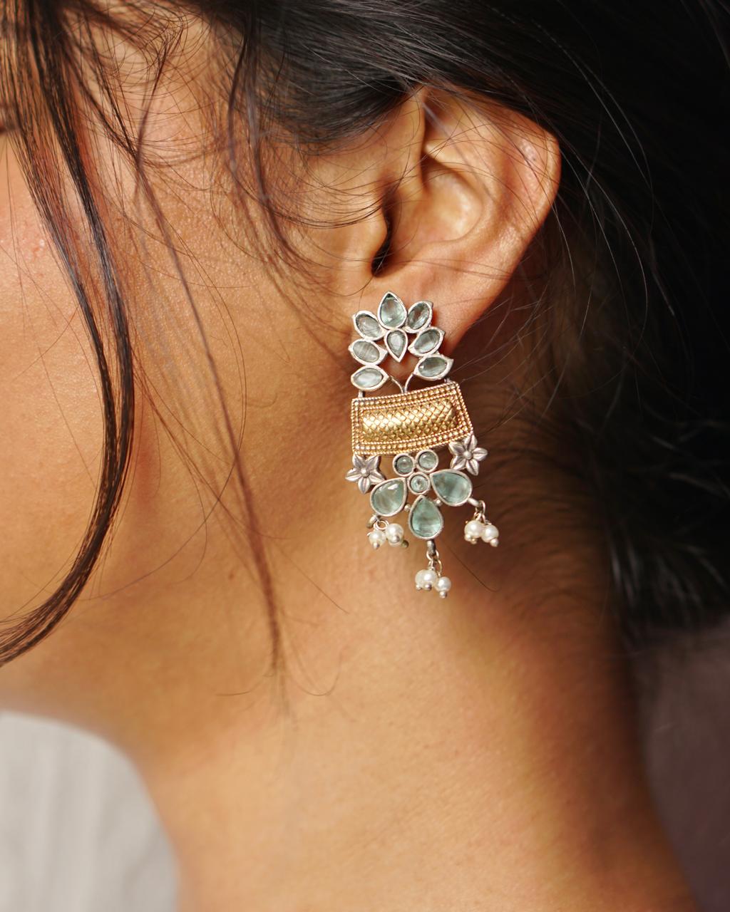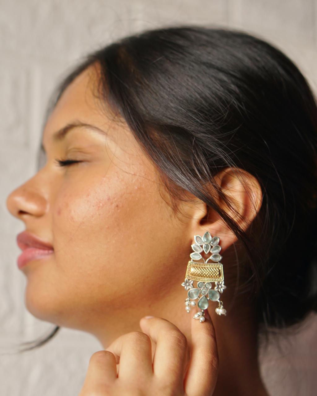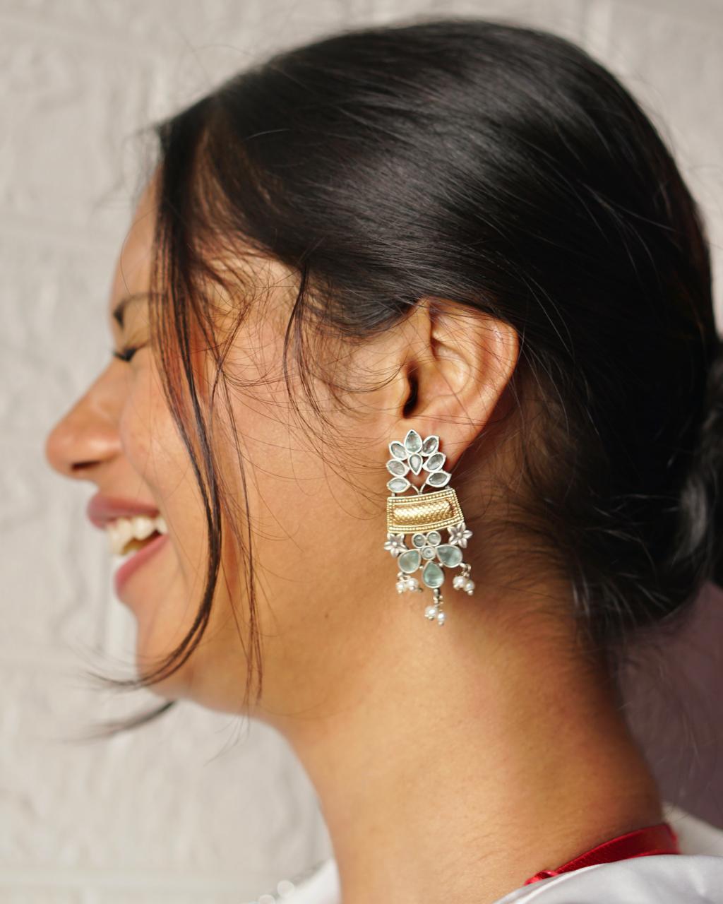 Fresh like spring, Gulzar is poetry carved in silver and dipped in pastels. This floral drop earring features soothing mint-green stones, dainty pearls, and just the right touch of gold. A dreamy pick for day functions, mehendis, or minimal bridesmaid vibes.