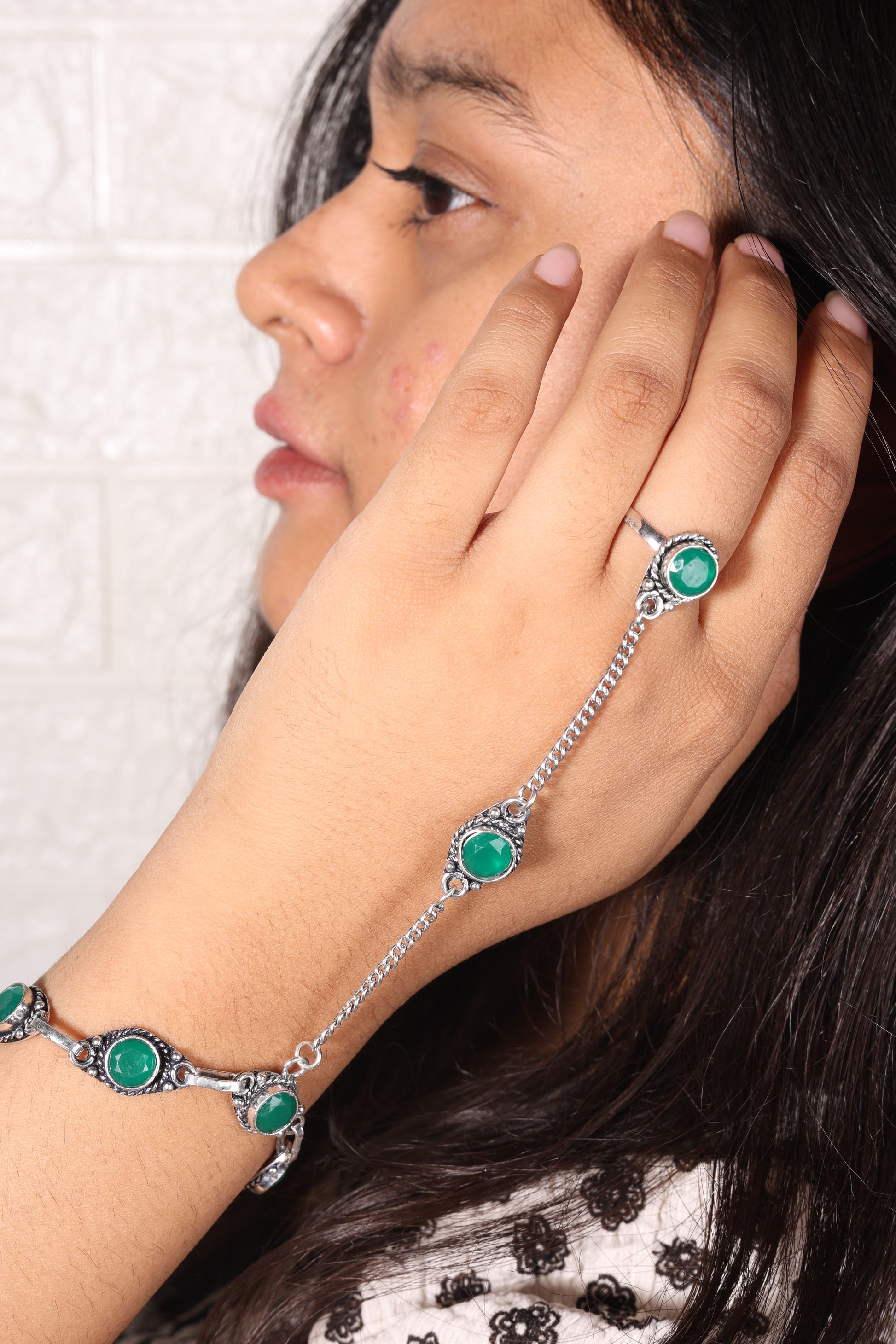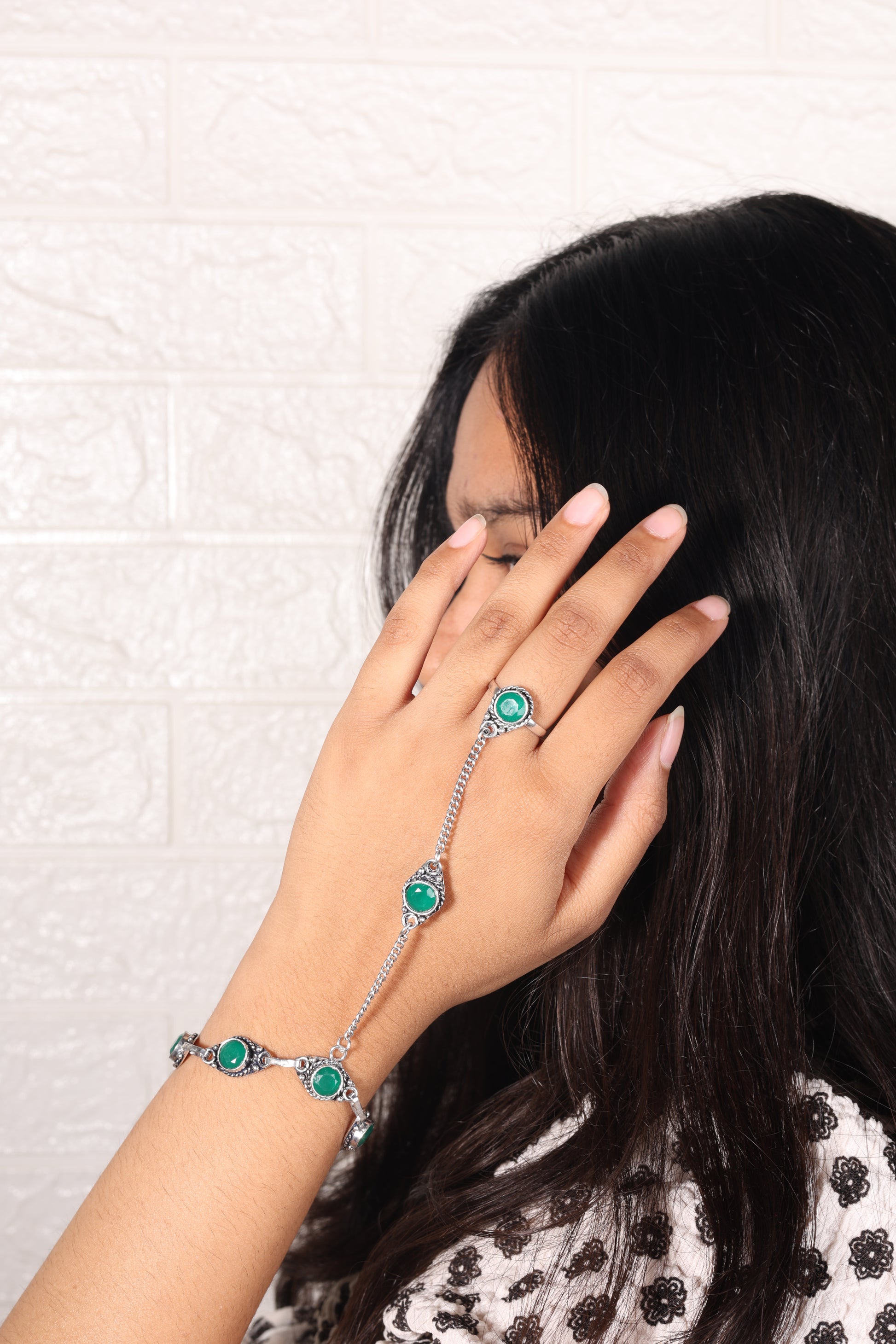 Pearla Hand Harness by Evoque, a stunning silver bracelet-ring chain featuring delicate pearls. Perfect for weddings, parties, and everyday elegance, this statement jewellery piece adds sophistication to any look. Ideal as a gifting accessory for women who love unique and versatile designs.