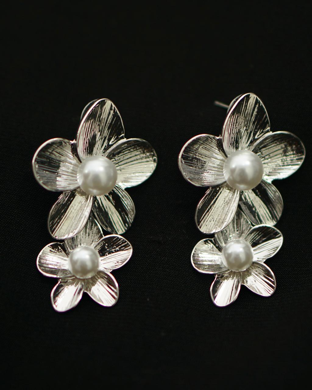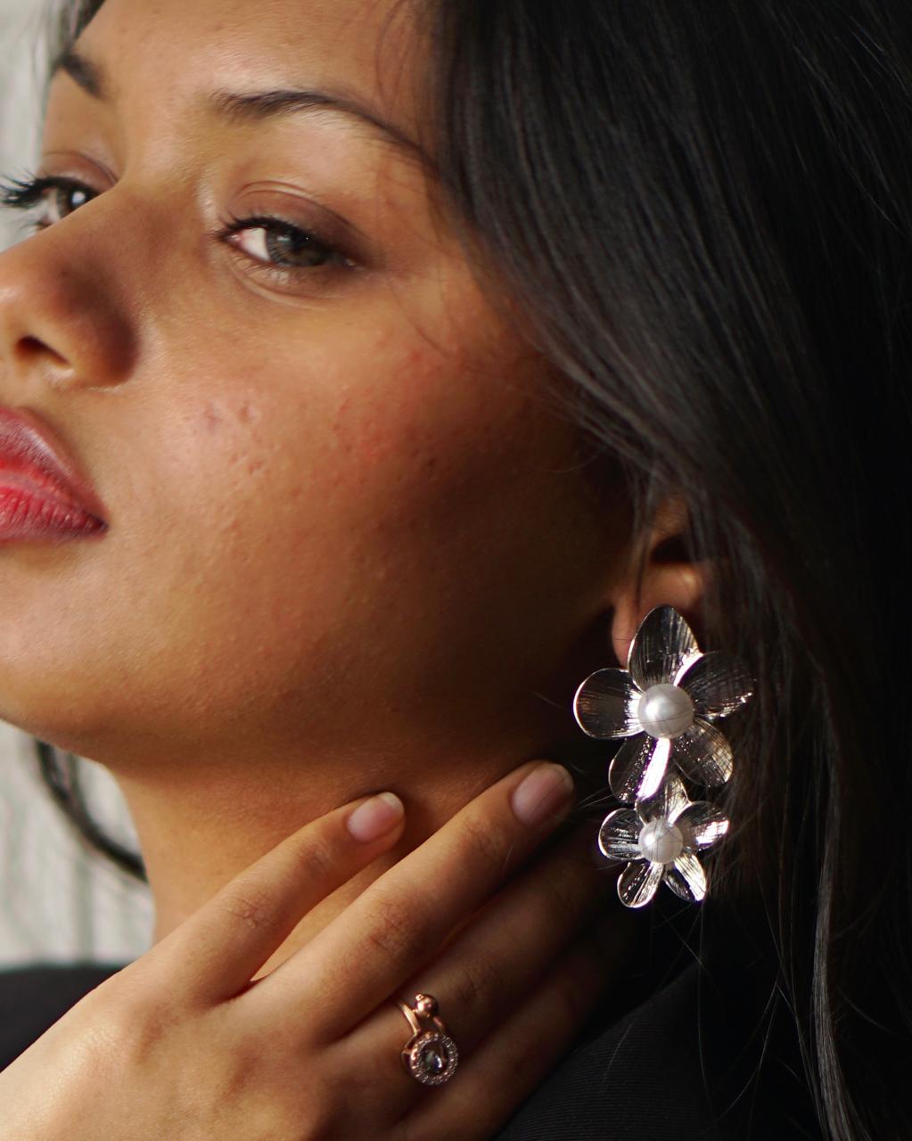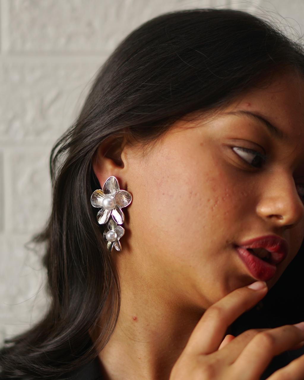 Shiny, simple, and stylish — Silver Bloom is a pair of silver floral earrings designed to add a soft sparkle to your everyday and festive outfits. With two delicate flower layers, each detailed with a glowing pearl in the center, these earrings give a clean and elegant look.